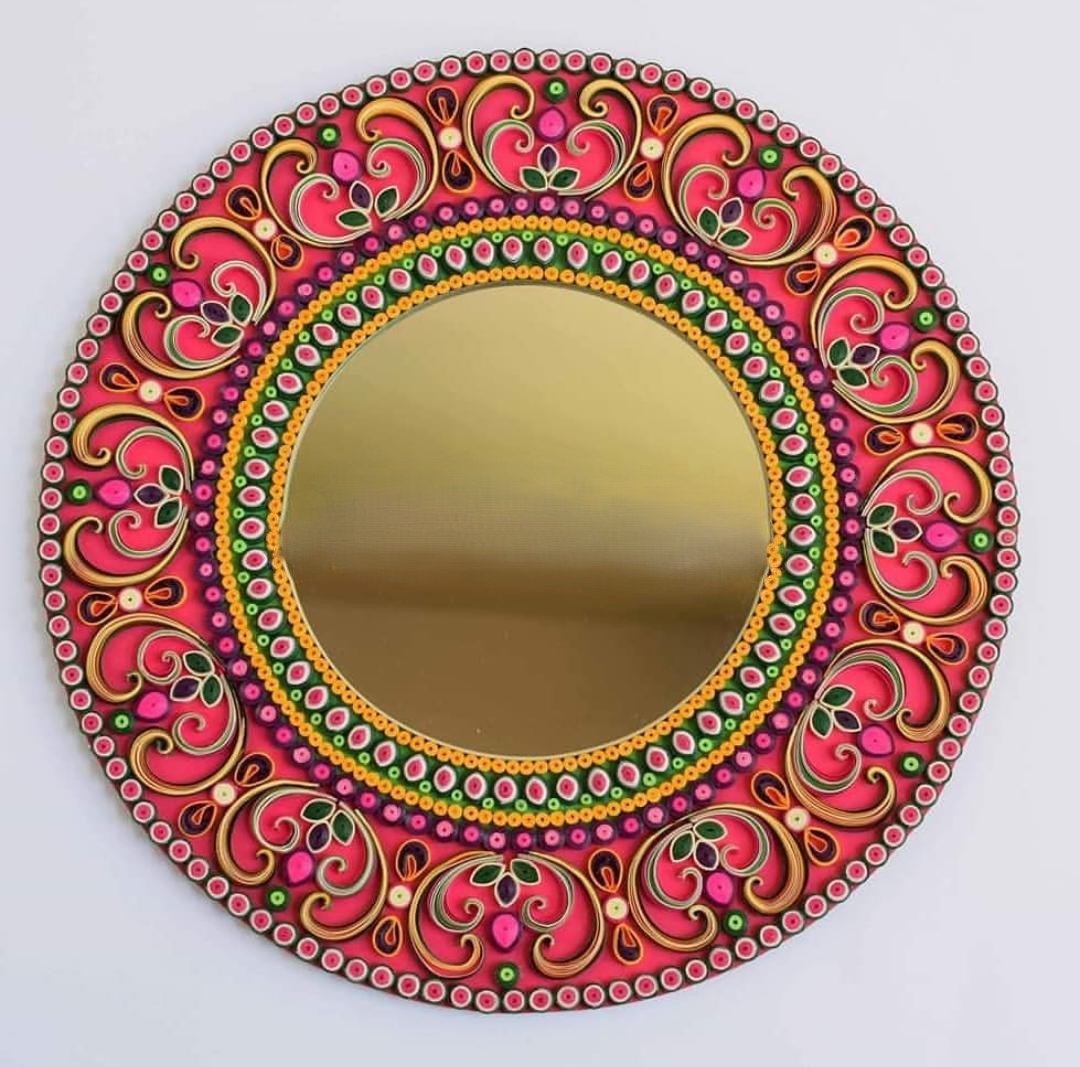 A stunning handcrafted Quilled Mirror Wall Art featuring intricate mandala-inspired designs. Perfect for home decor, gifting, and adding a vibrant artistic touch to your walls.